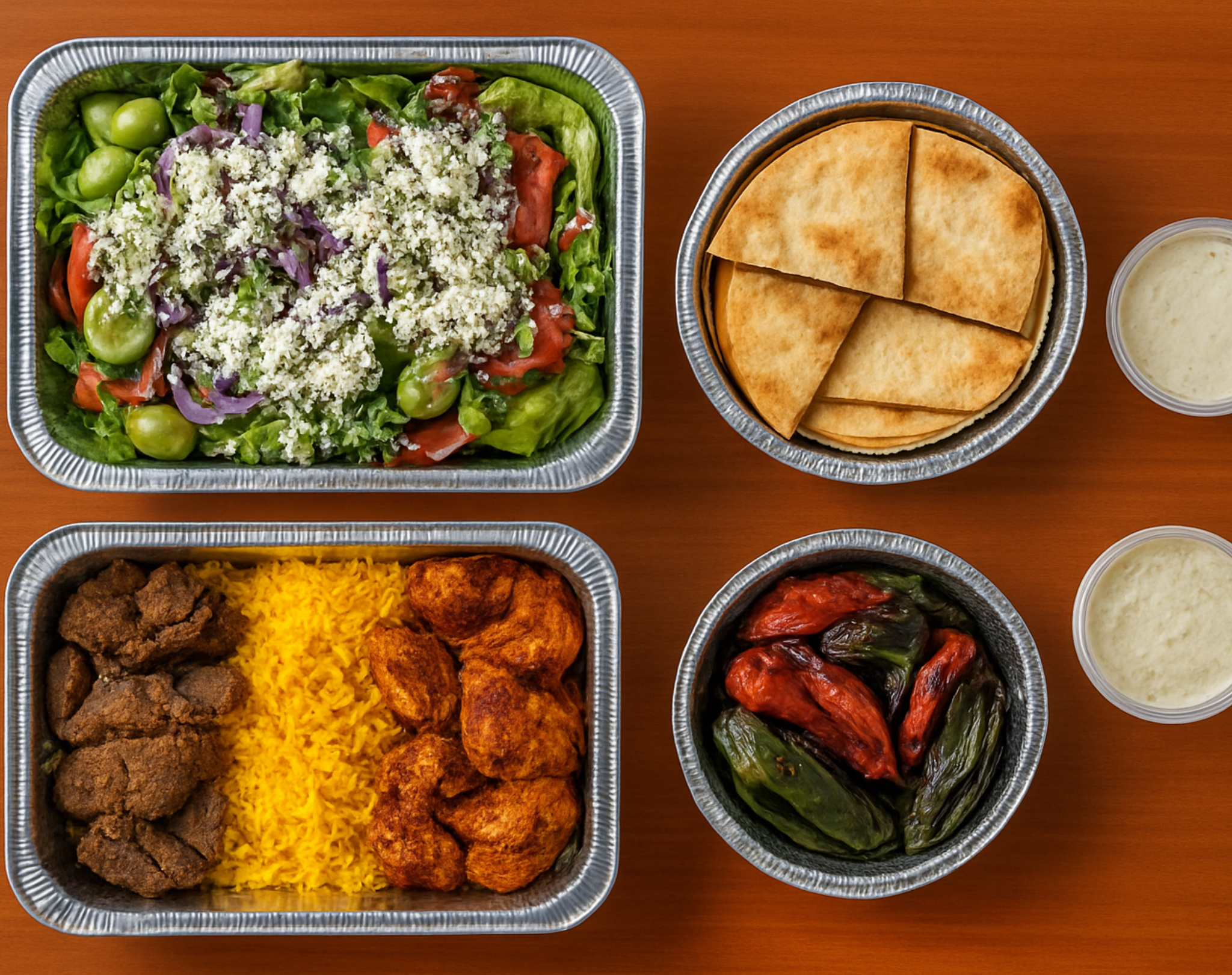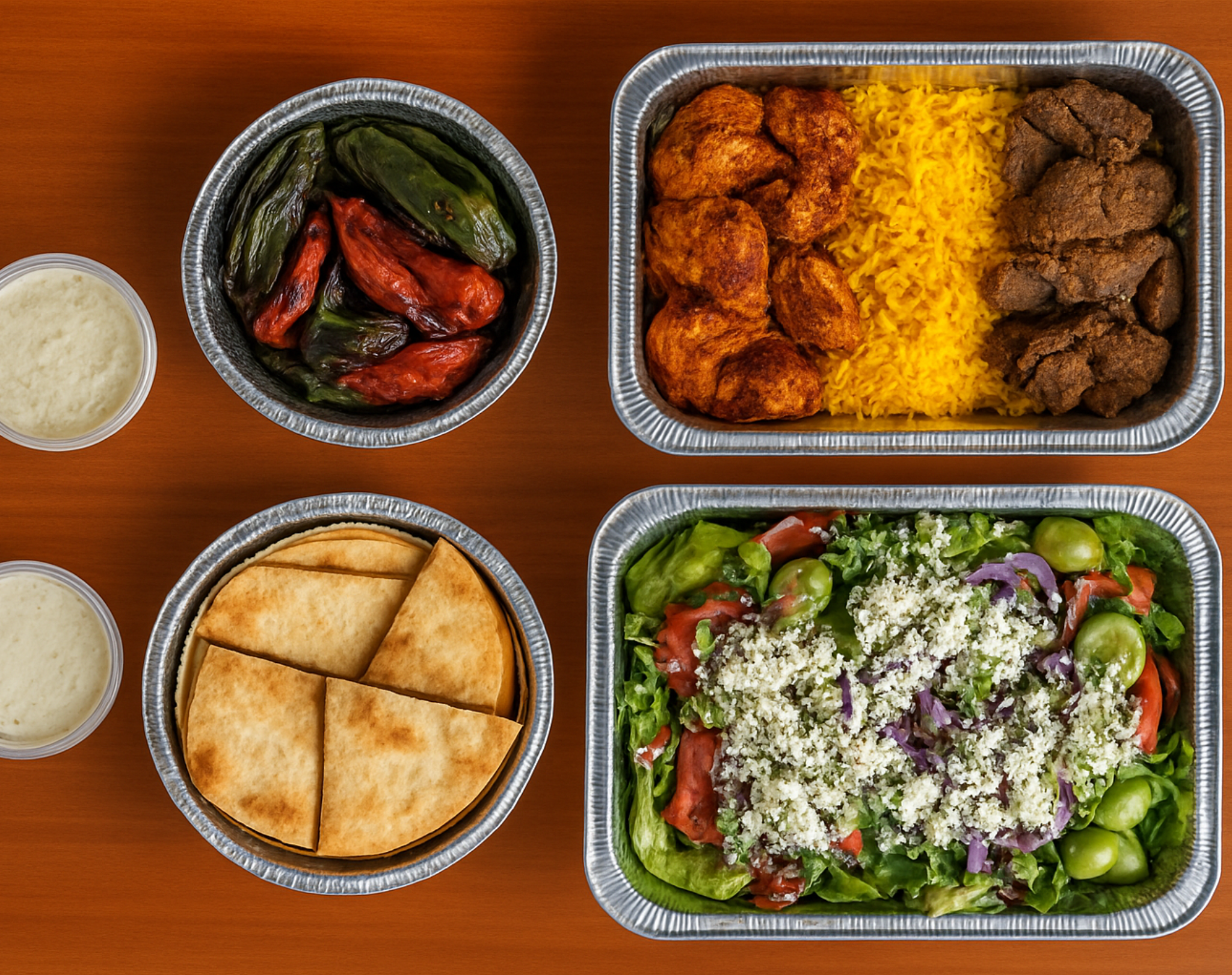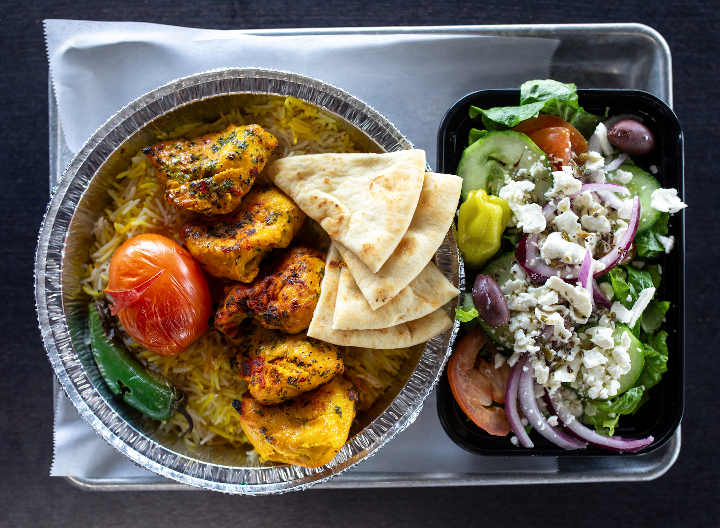 CHICKEN KABOB + ANOTHER PROTEIN OPTION + RICE + PITA + GREEK SALAD + GRILLED VEGGIES + SAUCE OF CHOICE